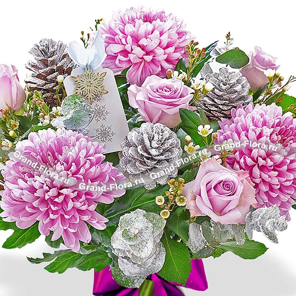 Люкс: хризантема одноголовая фиолетовая - 5 шт., роза Аква - 4 шт., эвкалипт  декорированный серебром) - 3 шт., рускус - 3 шт., шишки (декорированные  серебром) - 2 шт., бант фиолетовый.