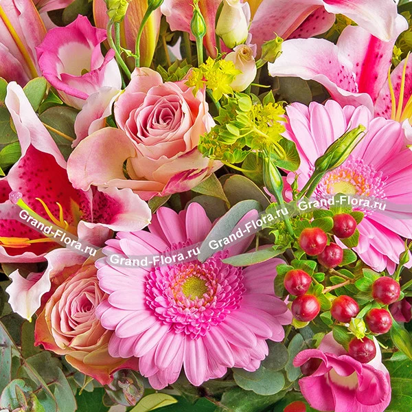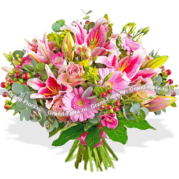 Стандартный: лилия розовая - 2 шт., роза розовая - 5 шт., гербера розовая - 4 шт., эустома розовая - 3 шт., гиперикум красный - 3 шт., эвкалипт - 3 шт., рускус - 3 шт., бант розовый.