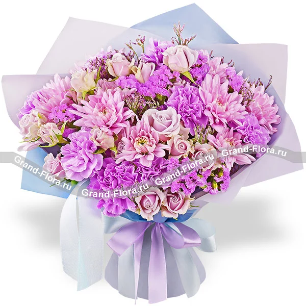 Стандартный: диантус фиолетовый - 3 шт., хризантема кустовая ромашковая фиолетовая - 2 шт., кустовая роза фиолетовая - 2 шт., статица, лимониум, упаковка, лента.